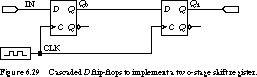 Figure 6.29 illustrates the problem. Here, we cascade two D flip-flops so that the output from the first stage feeds the input to the second stage. Both flip-flops are controlled by the same clock signal. The purpose of this circuit is to transfer the current state of the first stage to the second stage while the first stage receives a new value. In other words, the second stage contains the value stored in the first stage during the previous clock period. This is an example of a shift register, a multibit memory with a capability of exchanging a single memory element's contents with its neighbors. We will see more of shift registers in Chapter 7.