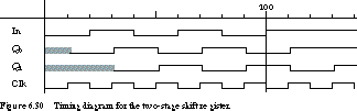 The proper logic operation of the circuit is shown in Figure 6.30, assuming that the flip-flops are positive edge-triggered and that the input stream is 0101011. Initially, both flip-flops contain unknown values. On the first rising edge of the clock, the input is 0 and appears at output Q0 a short propagation delay later. The state of the second flip-flop is still unknown.