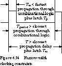 To guarantee that the correct next state has been computed, we also make sure that the period of the clock is longer than the worst-case propagation delay through the combinational logic. Because the next state signal actually has until the end of the high time of the clock to be computed, this constraint can be measured up to the falling edge of the clock, as long as the latch setup time is included. The constraints are shown in Figure 6.34.