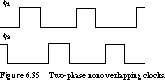 An Alternative to Narrow-Width Clocking: Multiphase Clocking Narrow-width clocking forces the designer to think about fast as well as slow paths through the logic. Finding these critical delays is even more of a problem because they vary with temperature and other environmental factors. An alternative is to use multiple-phase nonoverlapping clocks, the simplest case being a two-phase scheme. An example of a two-phase clock waveform is shown in Figure 6.35.