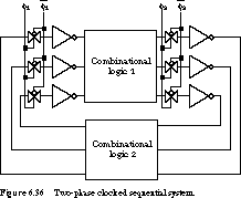 If we apply the two-phase scheme to the general clocked sequential system block diagram of Figure 6.33, we get the system shown in Figure 6.36.