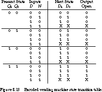 State Encoding At this point, we have a finite state machine with a minimum number of states, but it is still symbolic. See Figure 8.12 for the symbolic state transition table. The next step is state encoding.
