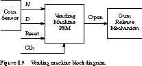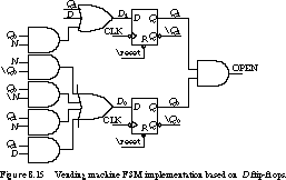 The way you encode the state can have a major effect on the amount of hardware you need to implement the machine. A natural state assignment would encode the states in 2 bits: state 0¢ as 00, state 5¢ as 01, state 10¢ as 10, and state 15¢ as 11. A less obvious assignment could lead to reduced hardware. The encoded state transition table is shown in Figure 8.13.
