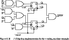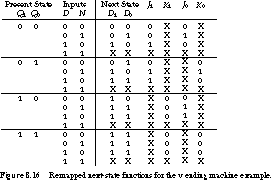To implement the state machine using J-K flip-flops, we must remap the next-state functions as in Chapter 7. The remapped state transition table for J-K flip-flop implementation is shown in Figure 8.16.