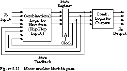 Figure 8.25 shows the notations for Mealy and Moore state diagrams, using the vending machine example. For Moore machines, the outputs are associated with the state in which they are asserted. Arcs are labeled with the input conditions that cause the transition from the state at the tail of the arc to the state at its head. Combinational logic functions are perfectly acceptable as arc labels.