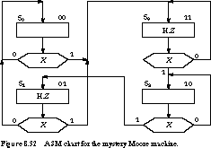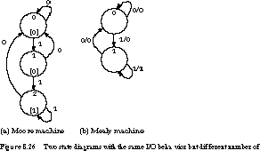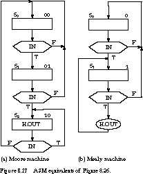 Consider a finite state machine that asserts its single output whenever its input string has at least two 1's in sequence. The minimum Moore and Mealy state diagrams are shown in Figure 8.26.